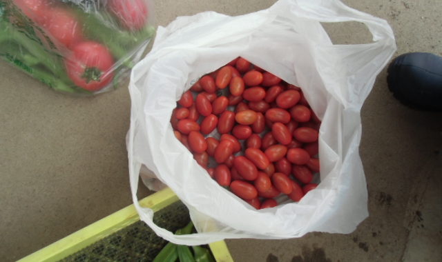 ワーイ!次はハウス内でのトマト、ミニトマトそれと茄子の収穫です。