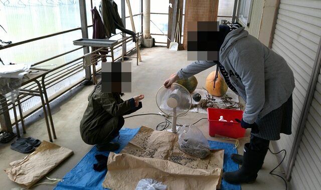風でもみ殻を飛ばす唐箕(とうみ)の原理で扇風機を使ってゴミや実入りの無い種を飛ばします。