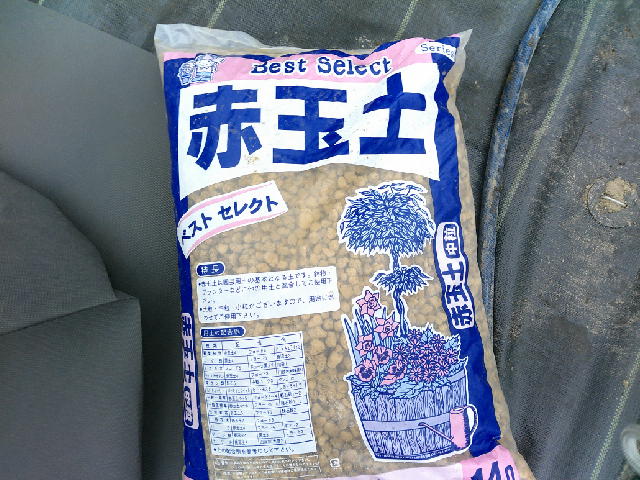 まずは、とろ船で赤玉石の大と小を各1袋に堆肥を混ぜ合わせます。