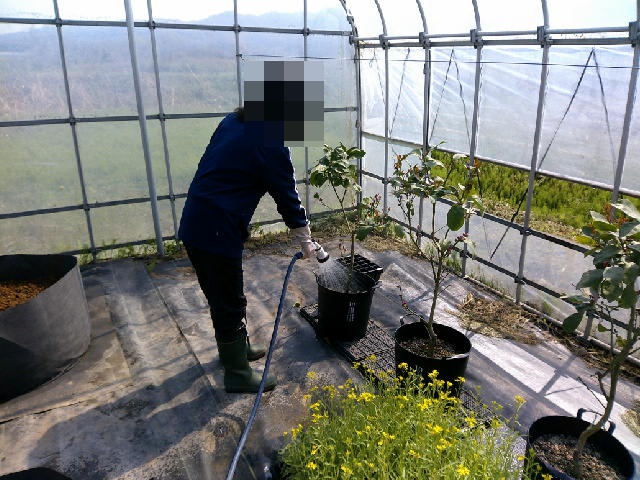 まずは、ハウス内の作物への水くれ作業から開始です。
