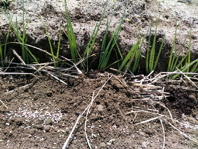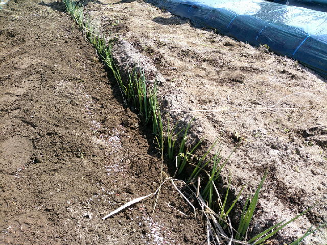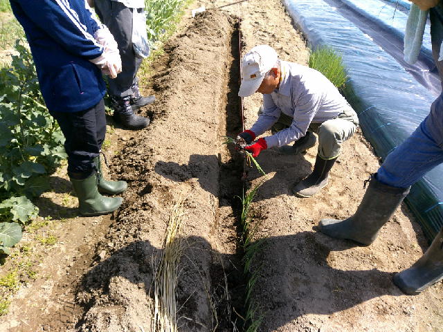 次は、屋外に出てネギの植え付けを行いました。3~4株ずつ分けて根の部分を軽く埋めていくよう教わりました。