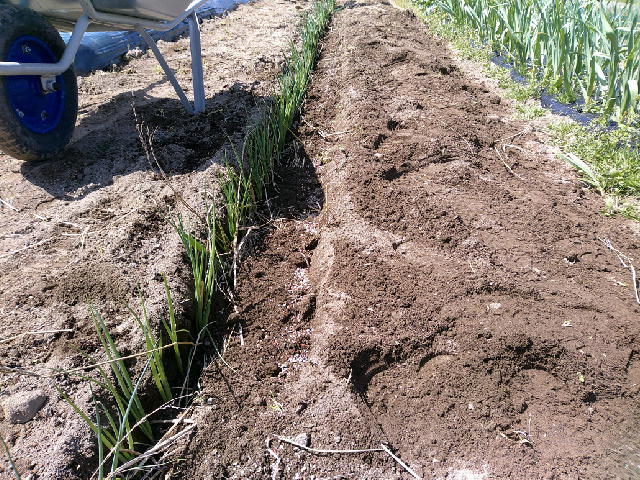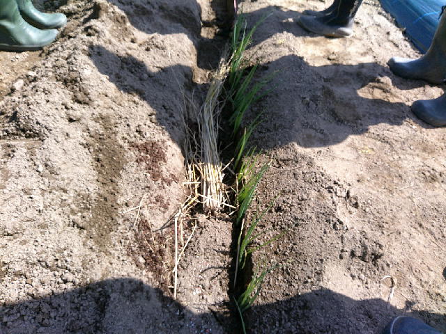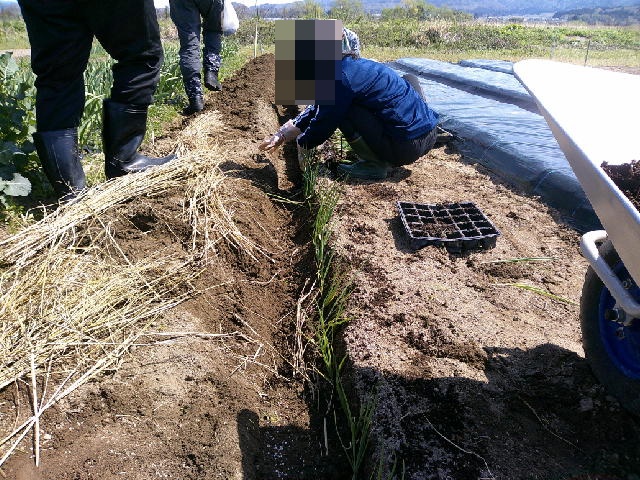 頑張って作業しています。稲わらの上に堆肥を入れてからさらに土をかぶせて、最後に肥料を撒きました。
