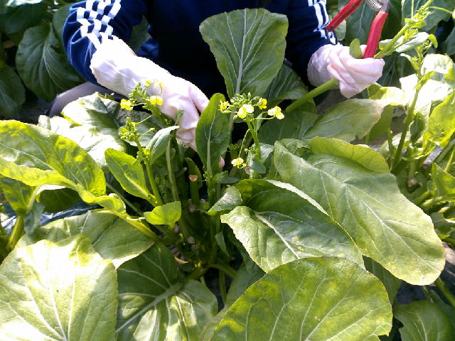 ここには、オータムポエムやホウレンソウ、カブ、からし菜が植えてあります。皆さんで雑草取りを行いました。
