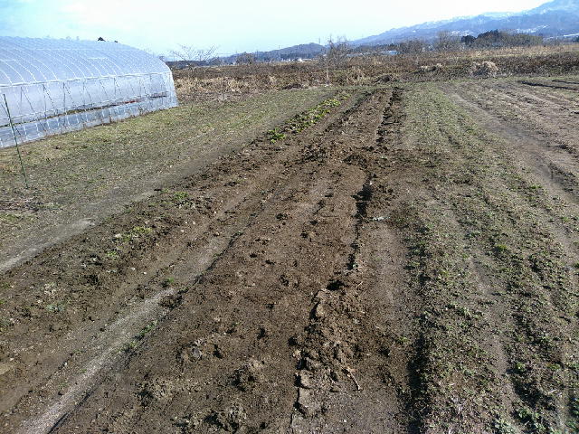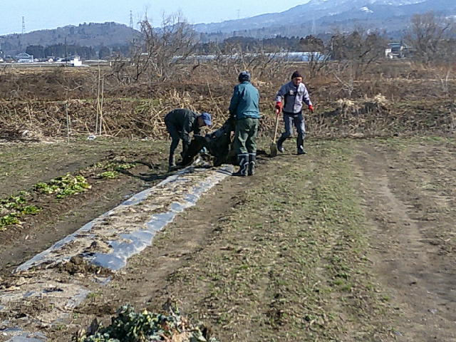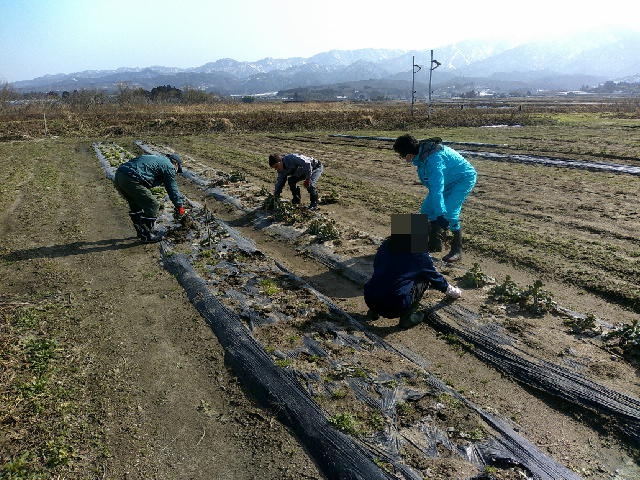 今日は気温が6℃で時折雨も強かったのですが、前半はハウス内で防草シート張り。後半は別のハウス内での除草作業でした。皆さんお疲れ様でした。